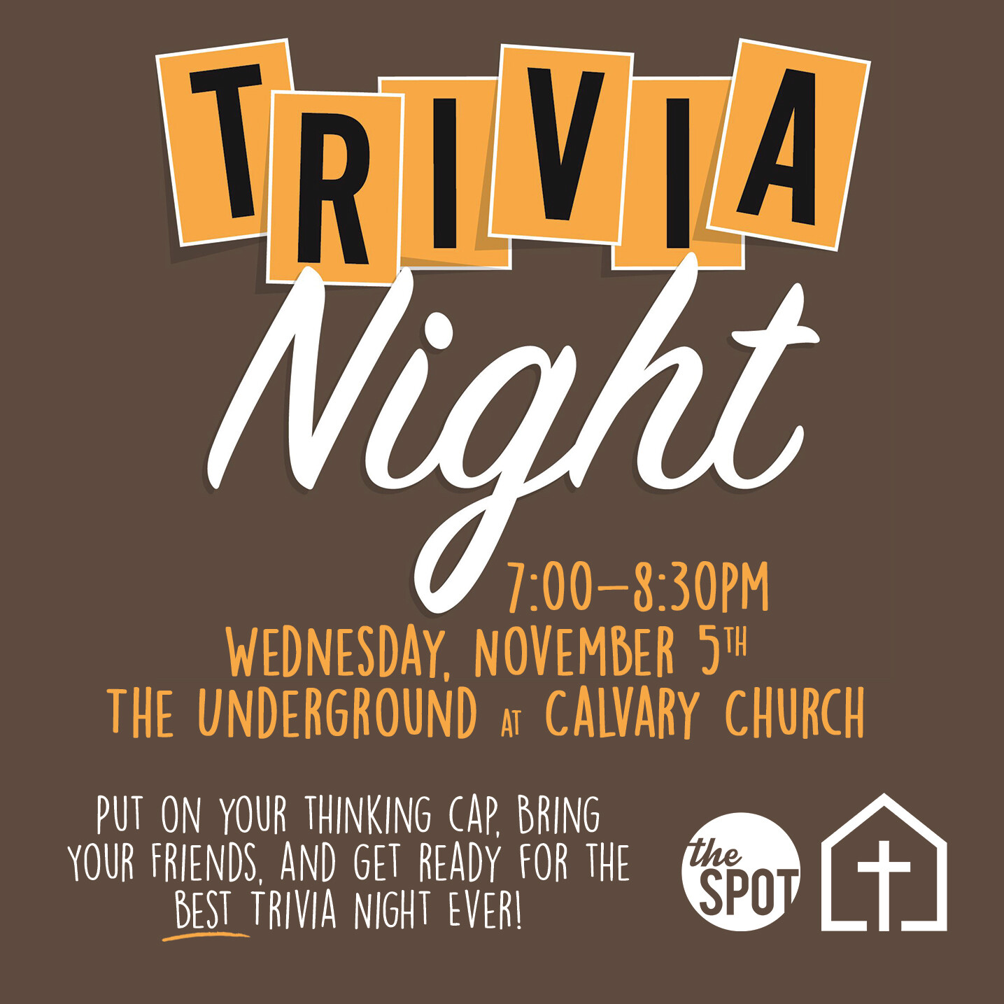 It’s time to put on your thinking caps because our annual Trivia Night is coming! We will cover all sorts or topics, from music and pop culture, to the Bible and sports! You will choose a crew of friends and leaders to form a small team to compete against others. This will be a fun and challenging night of trivia and a chance to win 1st place. Winning team gets FREE pizza and bragging rights! As always...BAB!