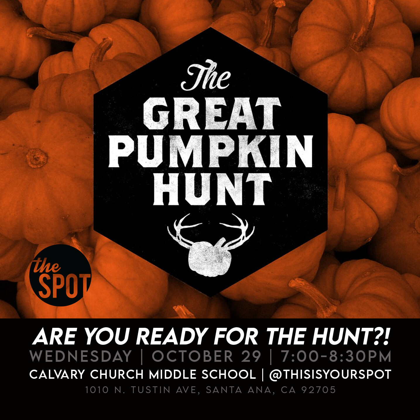 It's October and pumpkins are everywhere...You can't avoid it! So get ready because we are going to be hunting Calvary's campus for pumpkins! The more pumpkins you find…the better! ARE YOU READY FOR THE HUNT?! This will be a super fun night with prizes, worship, teaching, and more!