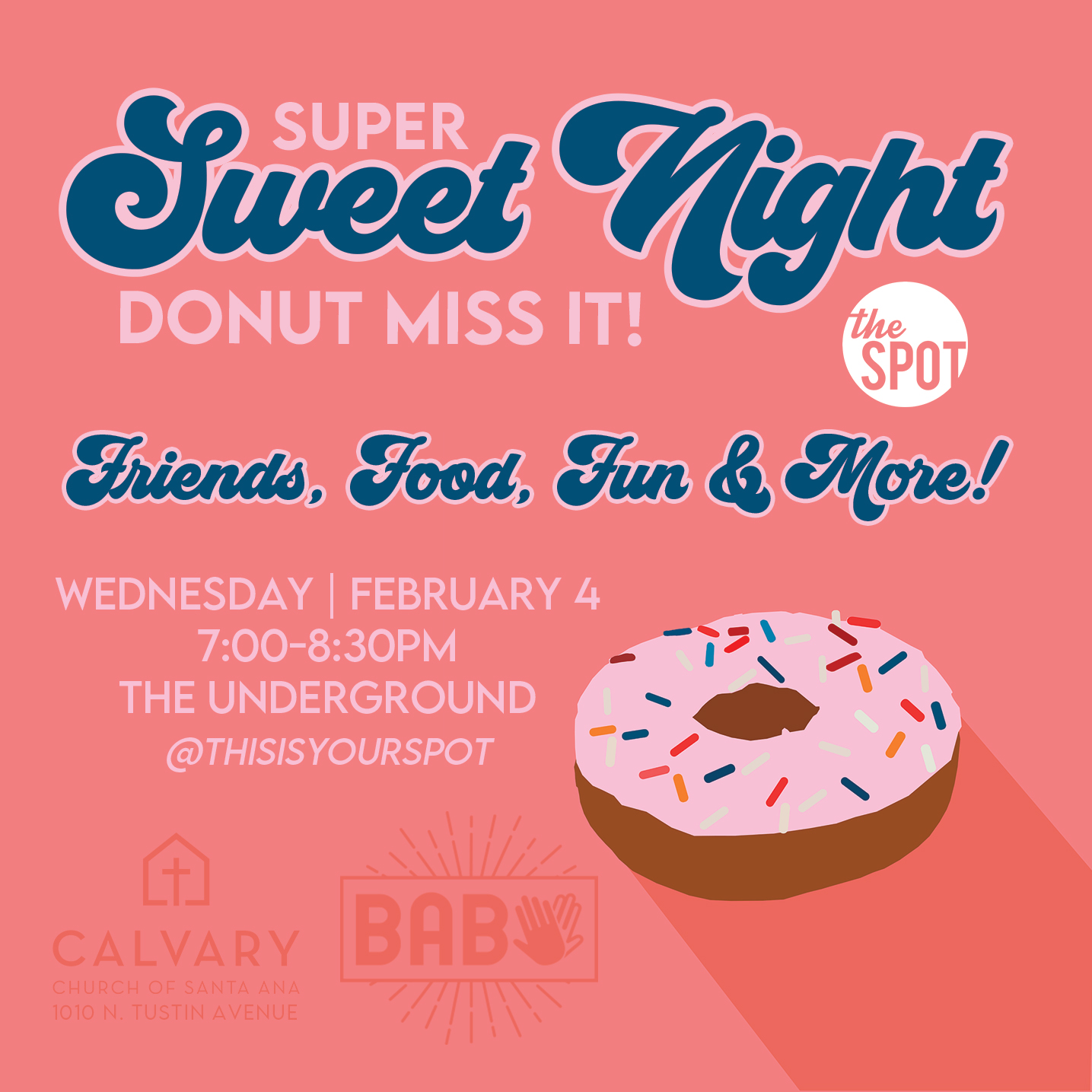 February is coming and it's gonna be SWEET! Join us for a SUPER SWEET NIGHT of donuts, games, prizes, worship, and teaching! If you are able, we’d love some more donations of sweets, snacks and prizes…Check out our Amazon Wishlist Here! Don’t forget to BAB…Bring A Buddy!